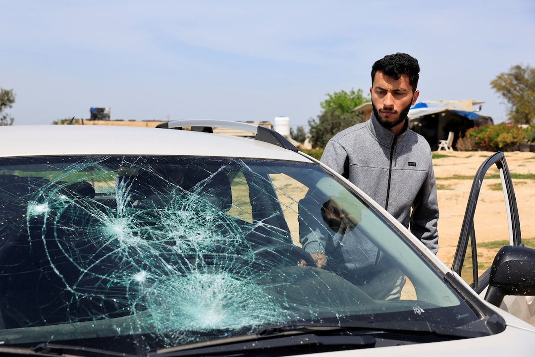 奧斯卡獲獎的巴勒斯坦導演巴塞爾·阿德拉在以色列佔領的約旦河西岸蘇西亞檢查一輛受損的汽車,2025年3月25日。路透社/穆薩·卡瓦斯馬來自一個名為“猶太人非暴力中心”的美國-加拿大人安娜·利普曼表示,她的團隊在暴力開始後大約15分鐘到達村莊時遭到定居者的襲擊。