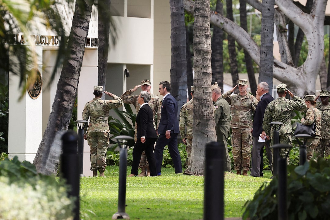 第1項,共9項 美國國防部長皮特·赫格塞斯在2025年3月25日於美國夏威夷珍珠港-希卡姆聯合基地的國防人員會計局與美國軍人交談。國防部/美國空軍高級空軍士兵馬德琳·基奇/通過路透社提供