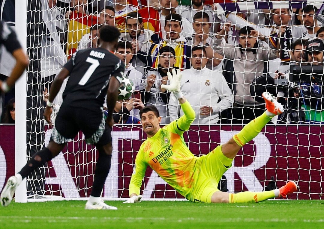 然而,薩卡選擇了勺子點球(帕年卡式),皇馬門將蒂博·庫爾圖瓦用指尖將球撲出。