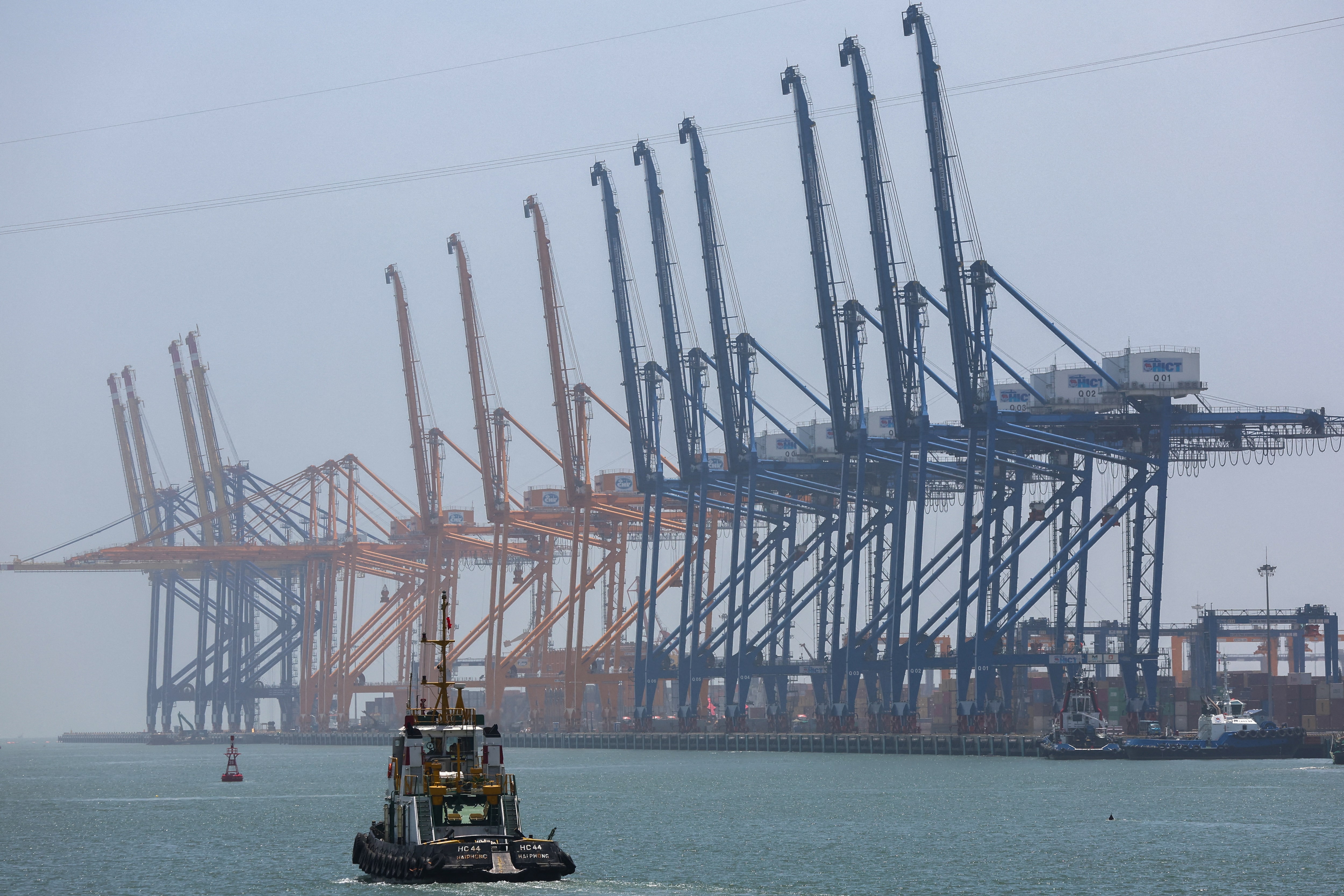 2025年4月16日,越南海防市,一艘貨輪停靠在海防國際集裝箱碼頭附近。此前美國總統特朗普宣佈對多國暫停加徵關税90天。路透社/Athit Perawongmetha攝路透河內4月17日電 - 行業高管表示,隨着美國訂單推遲或取消,越南部分工廠工人被要求提高對美市場產品產量,另一些工人則被調整為每週三個班次。
