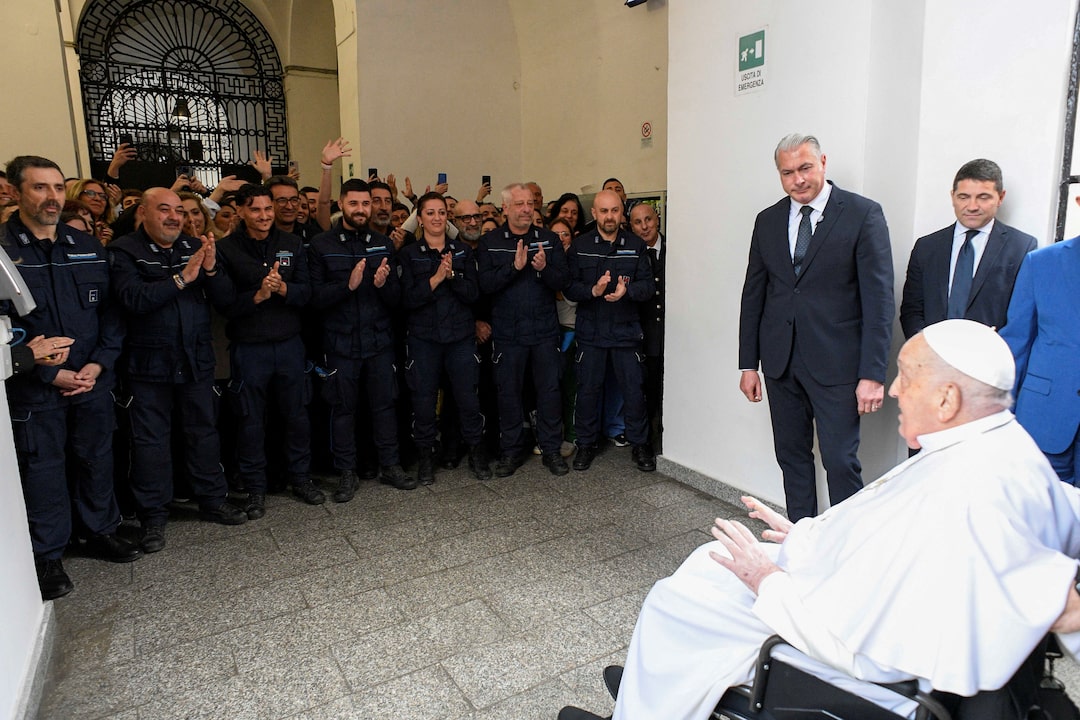 與他最近兩次公開露面時一樣,教皇…自主呼吸無需藉助氧氣管。方濟各在監獄停留約半小時。梵蒂岡表示他會見了約70名囚犯。“我想親近你們,“根據梵蒂岡的聲明,教皇説道,“我為你們和你們的家人祈禱。”