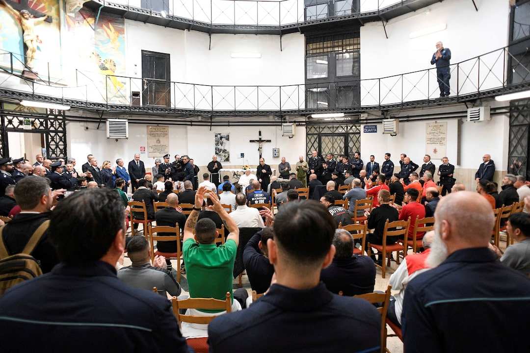 圖集1/4:2025年4月17日,教皇方濟各訪問意大利雷吉納·科埃利監獄。梵蒂岡媒體/通稿 經由路透社發佈