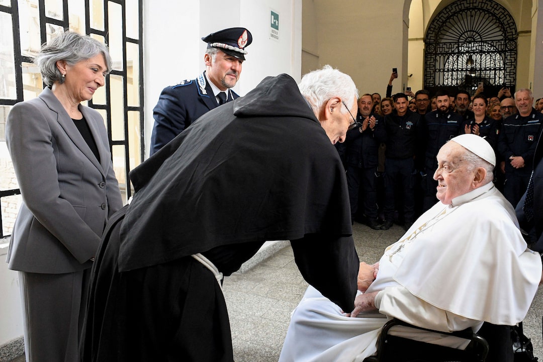 圖集1/4:2025年4月17日,教皇方濟各訪問意大利雷吉納·科埃利監獄。梵蒂岡媒體/通稿 經由路透社發佈