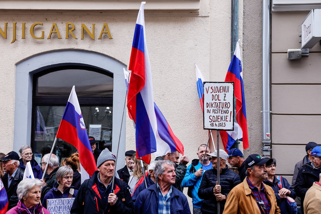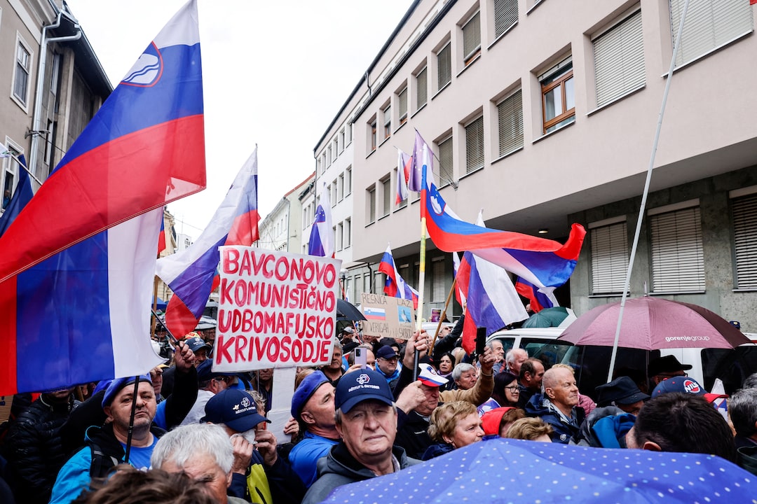 數百名他的支持者聚集在東部城鎮採列法院外,揮舞着斯洛文尼亞國旗,舉着指責司法腐敗和偏見的橫幅。