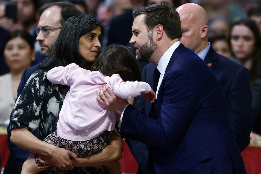 現場可見副總統與妻子烏莎及三名年幼子女共同入場,萬斯懷中抱着其中一個孩子。
