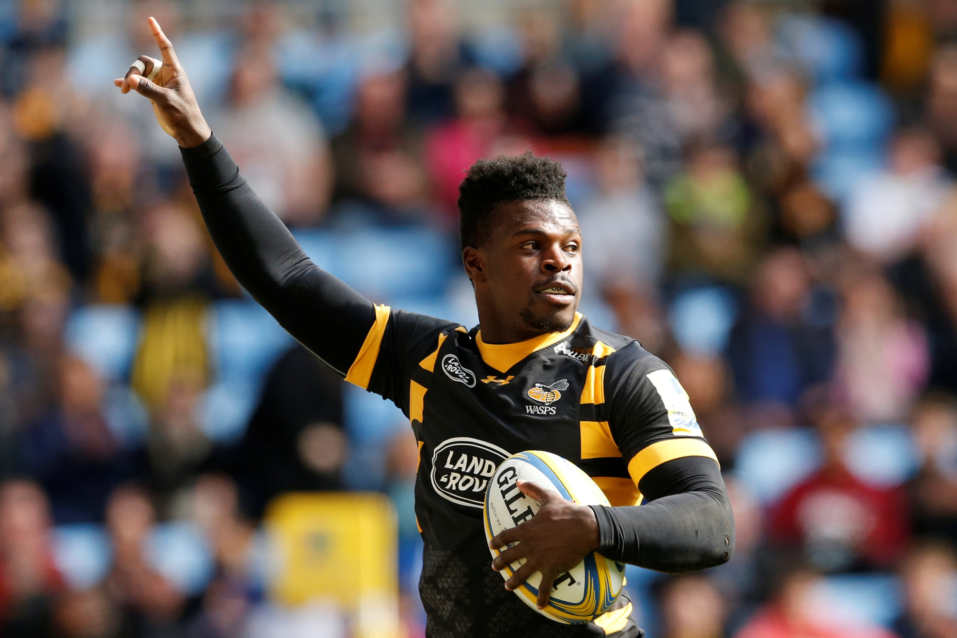 橄欖球聯盟 - 黃蜂隊對陣伍斯特勇士隊 - 英傑華英超聯賽 - 英國考文垂理光競技場 - 2017年3月26日 黃蜂隊球員克里斯蒂安·韋德達陣得分後慶祝 路透社通過Action Images/Andrew Boyers/檔案照片4月18日(路透社) - 維岡勇士隊週五宣佈,已與橄欖球聯盟邊鋒克里斯蒂安·韋德簽訂短期合約。這位前NFL跑衞將在結束與格洛斯特的英超賽季後加盟這支英格蘭超級聯賽冠軍隊伍。