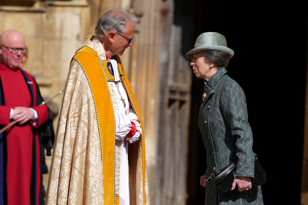 查爾斯與身着淡藍色禮帽裙裝的卡米拉,在温莎城堡內這座15世紀教堂與安德魯王子、愛德華王子、安妮長公主及其他王室成員共同出席儀式。