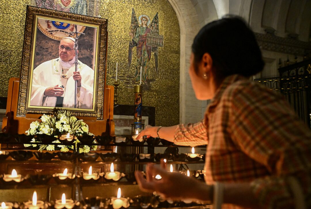 5項中的第1項 一名女子在梵蒂岡宣佈教皇方濟各去世後,於馬尼拉大教堂獻上蠟燭