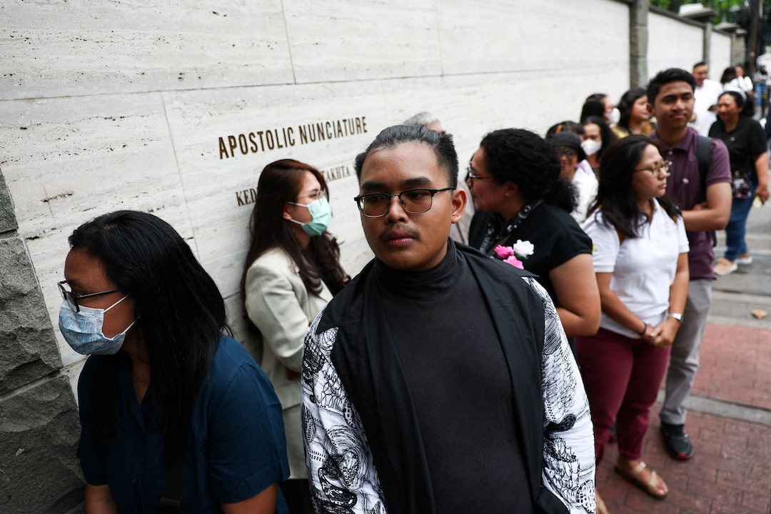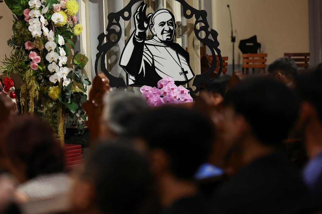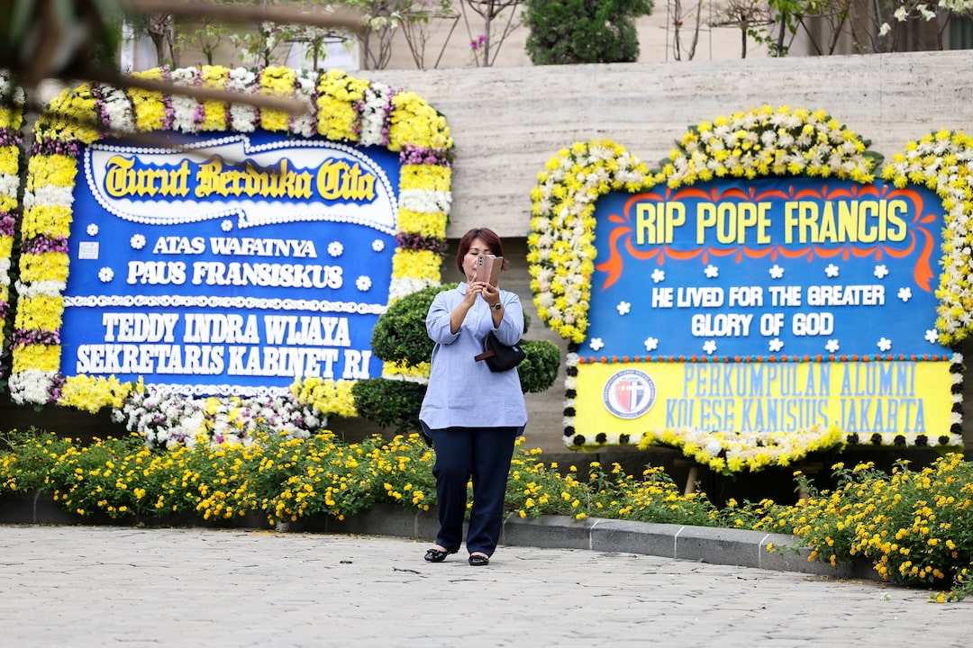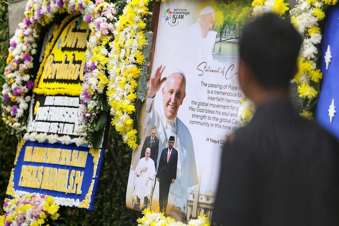 7項中的第1項 2025年4月22日,印度尼西亞雅加達,一名行人走過教宗方濟各去世後設在宗座代表處的花圈。路透社/Willy Kurniawan