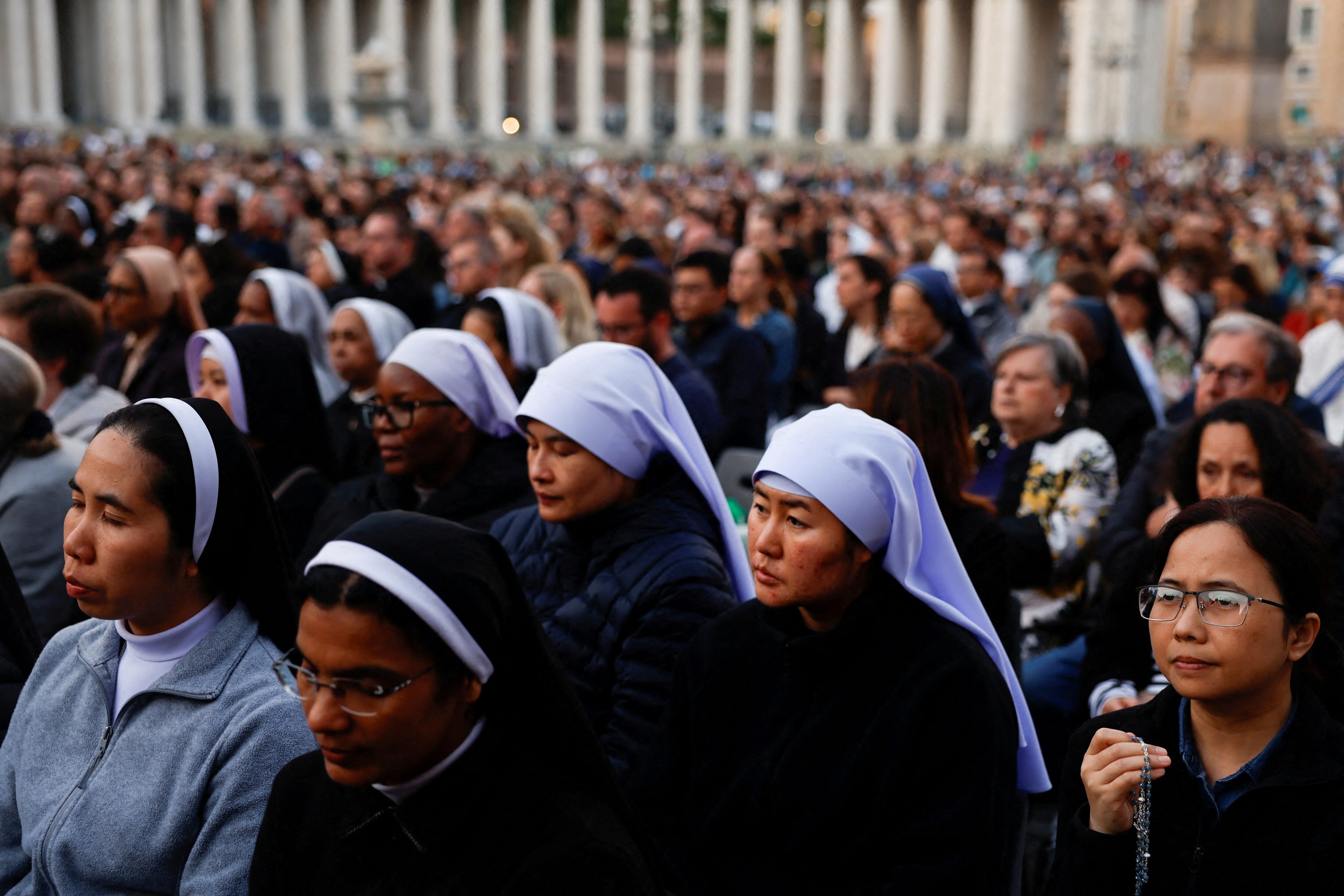 檔案照片:2025年4月21日,在梵蒂岡聖彼得廣場,教宗方濟各去世後,修女與信徒們參加為教宗舉行的玫瑰經祈禱會。路透社/Susana Vera 梵蒂岡城,4月22日(路透社)——梵蒂岡在一份聲明中宣佈,教宗方濟各的葬禮將於當地時間4月26日星期六上午10:00(格林尼治標準時間0800)在聖彼得大教堂舉行。