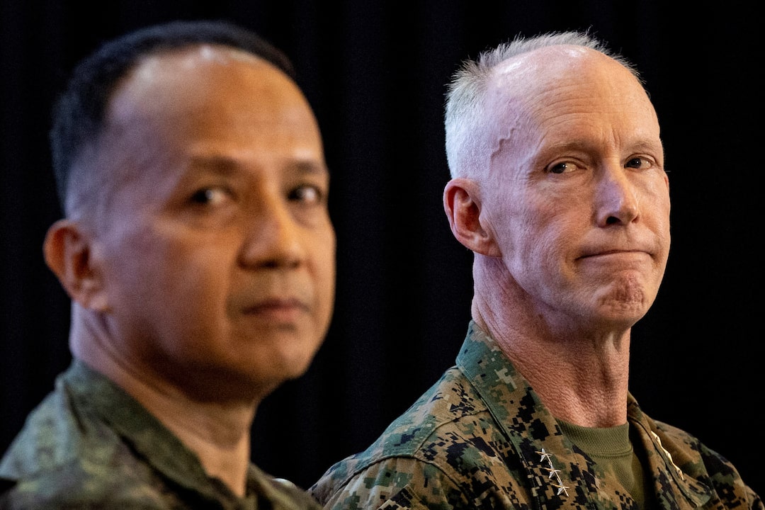 2025年4月21日,在菲律賓大馬尼拉奎松市的菲律賓武裝部隊總部,菲律賓"肩並肩"演習總指揮弗朗西斯科·洛倫佐少將、菲律賓武裝部隊總參謀長羅密歐·布勞納中將、菲律賓外交部長恩裏克·馬納洛、美國駐菲律賓大使瑪麗凱·卡爾森、美國"肩並肩"演習總指揮詹姆斯·格林中將以及菲律賓武裝部隊教育、訓練與條令副參謀長盧埃林·S·巴納格少將,在年度菲美聯合軍事演習"肩並肩"開幕式上合影。路透社/埃洛伊薩·洛佩茲/檔案照片