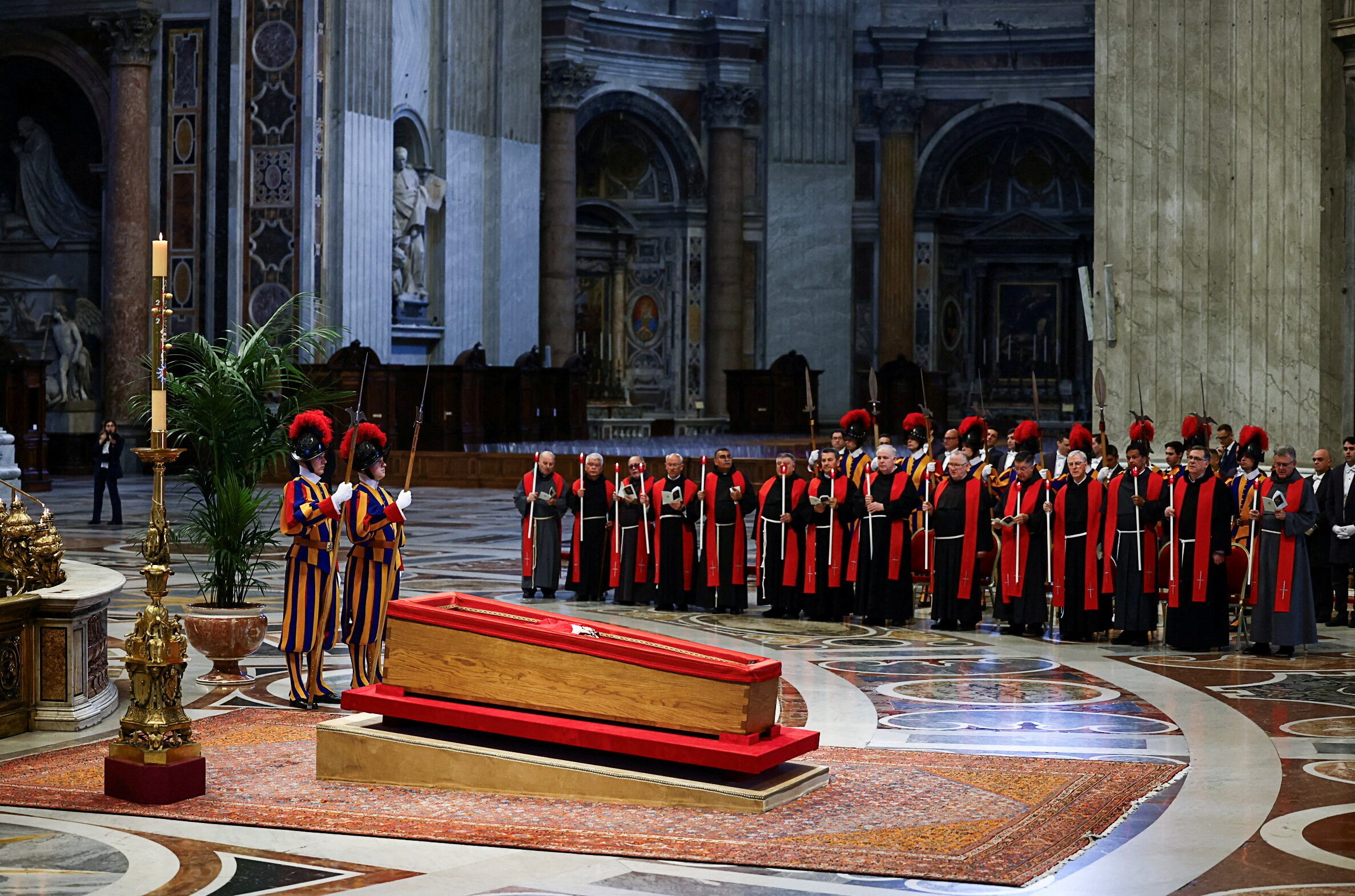 2025年4月23日,梵蒂岡聖彼得大教堂內,瑞士衞隊成員站立在裝有教宗方濟各遺體的靈柩旁,當日為遺體轉移日。路透社/Yara Nardi羅馬,4月24日(路透社)——教宗方濟各於4月21日上午逝世,享年88歲。