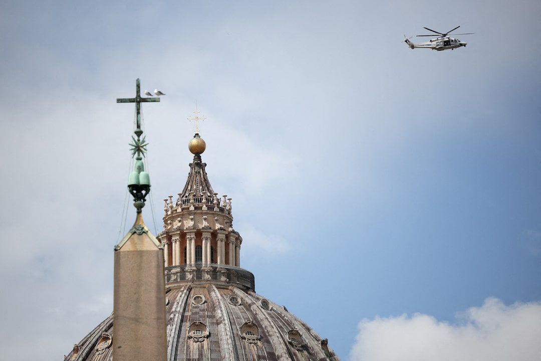 3項中的第1項 2025年4月24日,從意大利羅馬可見,一架警用直升機飛越聖彼得大教堂圓頂上方,當時教皇方濟各正停靈於此。路透社/古列爾莫·曼賈帕內