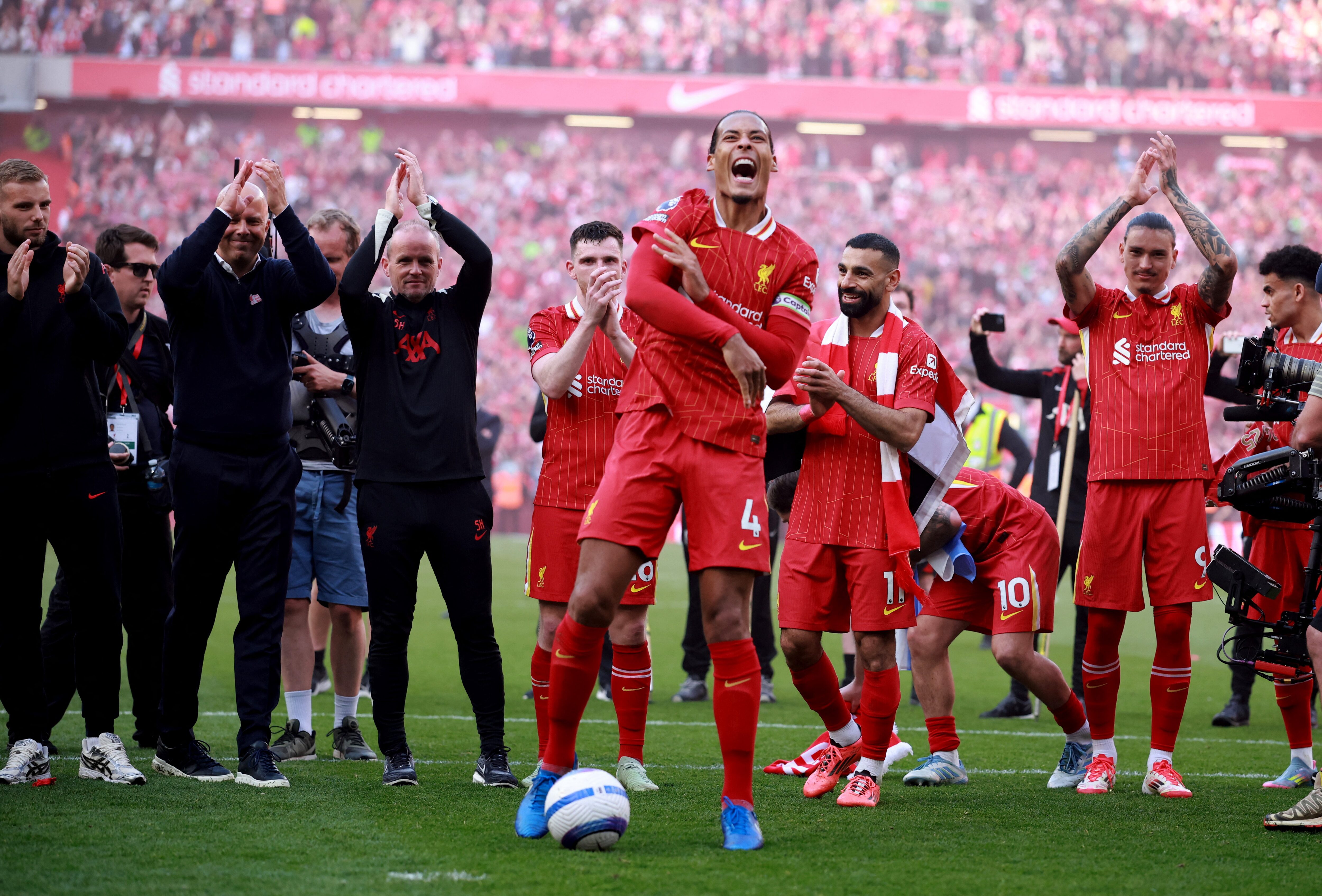 足球 足球 - 英超聯賽 - 利物浦對陣托特納姆熱刺 - 英國利物浦安菲爾德球場 - 2025年4月27日 利物浦隊的維吉爾·範迪克與隊友們在贏得英超冠軍後慶祝 路透社/菲爾·諾布爾 路透社英國利物浦4月27日電 - 利物浦隊在陽光普照的安菲爾德球場進行的關鍵戰役中,逆轉落後局面以5-1大勝托特納姆熱刺,以華麗姿態捧起英超冠軍獎盃。