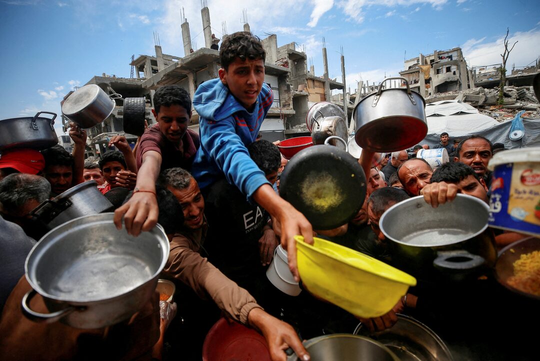 2025年4月28日,加沙地帶北部拜特拉希亞,巴勒斯坦民眾排隊等候慈善廚房發放食物。路透社/Mahmoud Issa (路透海牙4月28日電)聯合國代表與巴勒斯坦方在國際法院首日聽證會上指控以色列違反國際法,阻撓人道援助進入加沙。此次聽證會聚焦以色列在援助物資輸送方面的法律義務。