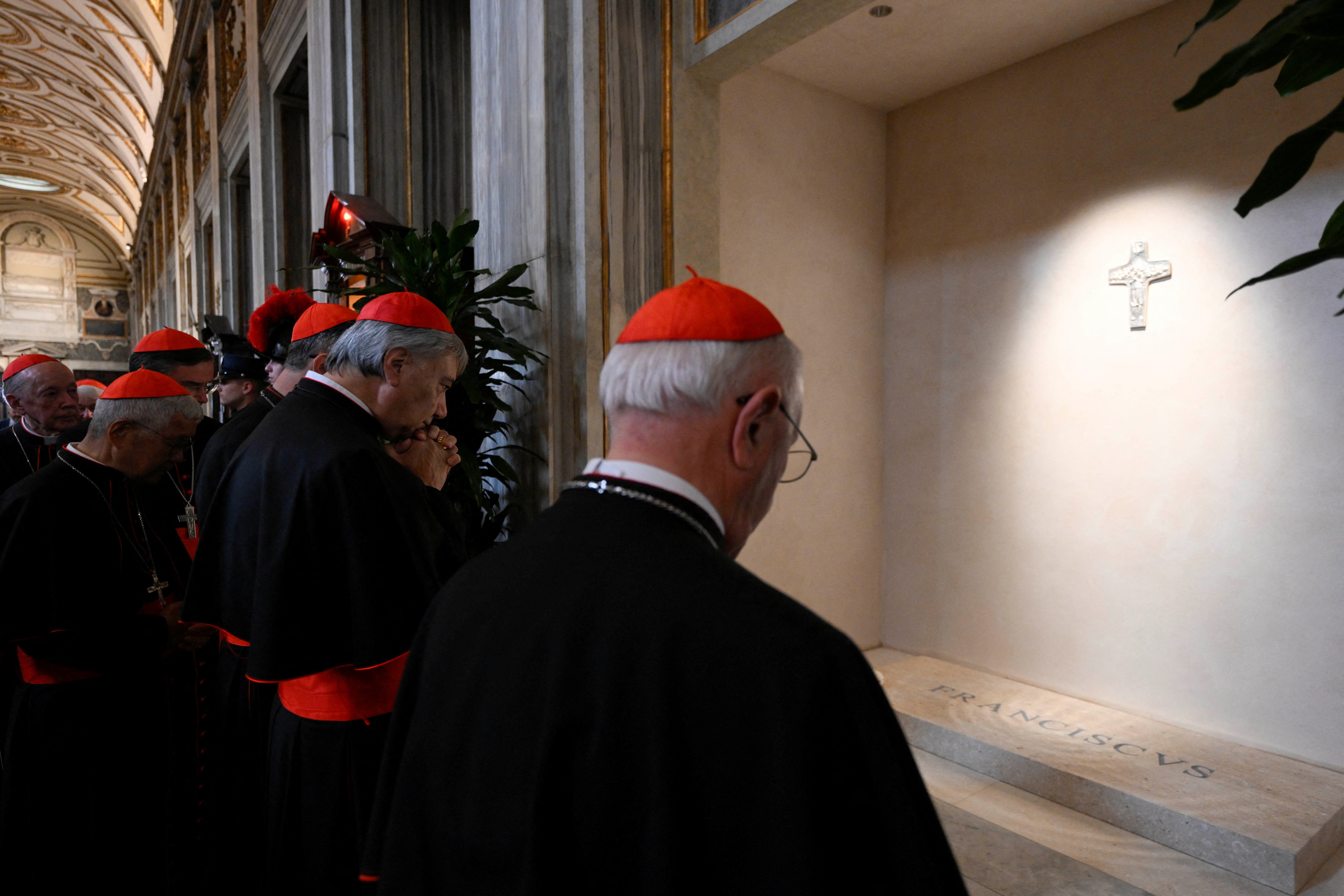 2025年4月27日,意大利羅馬,紅衣主教們參觀位於聖母大殿的教皇方濟各陵墓。西蒙尼·裏索盧蒂/梵蒂岡媒體/路透社供圖梵蒂岡城,4月28日(路透社)——教皇所戴的白色主教冠沉重無比。無論誰在即將到來的秘密會議中成為擁有14億信徒的天主教會新領袖,都將面臨無數難題。