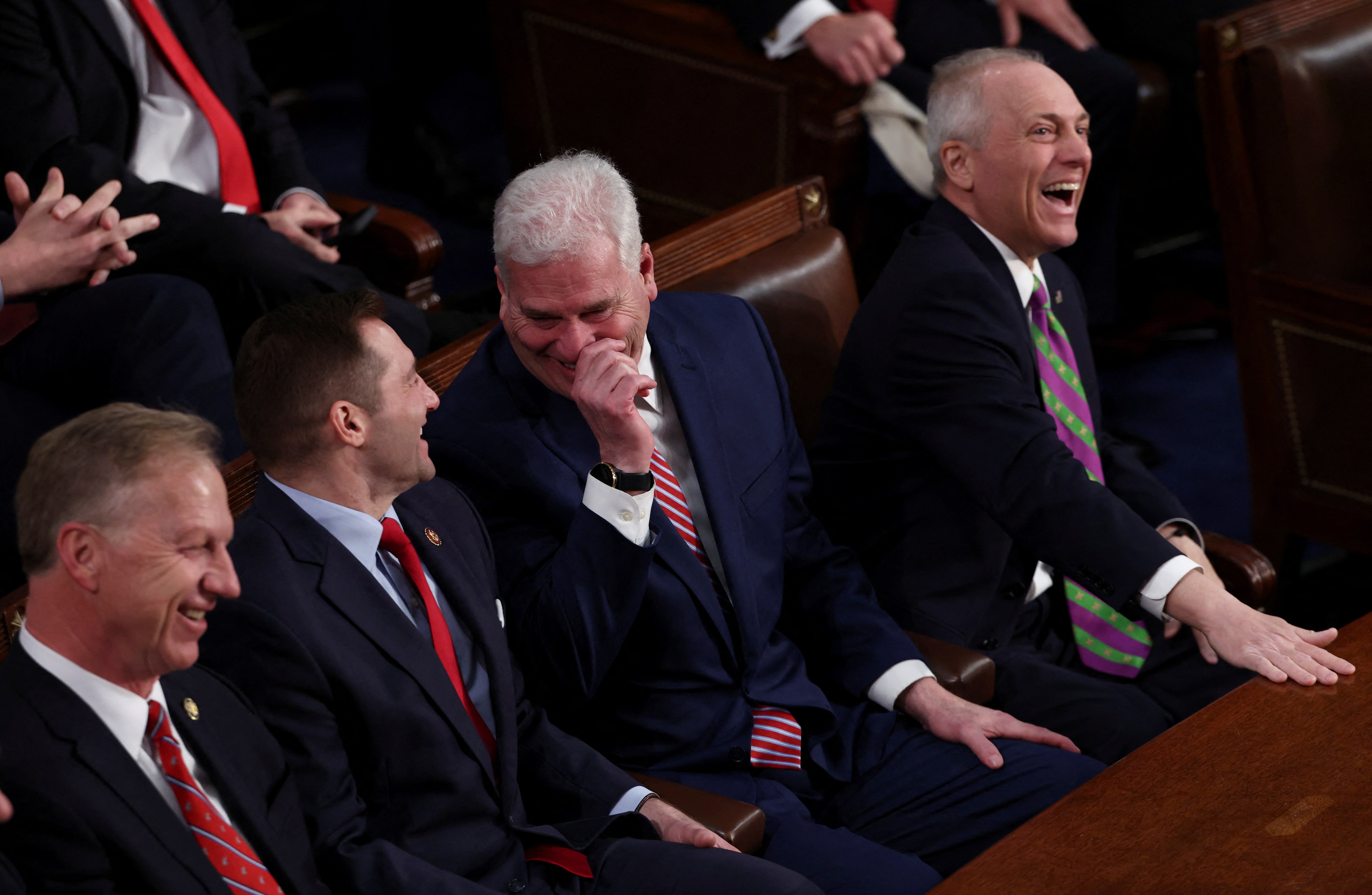 2025年3月4日,美國華盛頓特區國會大廈眾議院會議廳,包括多數黨黨鞭明尼蘇達州共和黨眾議員湯姆·埃默和眾議院多數黨領袖史蒂夫·斯卡利斯在內的共和黨人,在時任總統唐納德·特朗普向國會發表聯合演講時作出反應。路透社/伊芙琳·霍克斯坦/資料圖片華盛頓,4月28日(路透社)——美國國會共和黨人本週將認真應對特朗普總統任期內的最大挑戰:試圖彌合黨內對削減醫療補助計劃和受歡迎的可再生能源計劃的提案分歧,以期為具有里程碑意義的減税法案籌措資金,他們希望該法案能在6月前生效。經過為期兩週的休會期,期間共和黨眾議員在選區與選民發生激烈交鋒後,眾議院共和黨人將開始就特朗普議程立法部分內容展開辯論和投票,該立法還將為其打擊移民政策提供資金,並支持化石燃料生產和增加軍費開支。路透社關税觀察簡報是您獲取全球貿易和關税最新動態的每日指南。點擊此處註冊