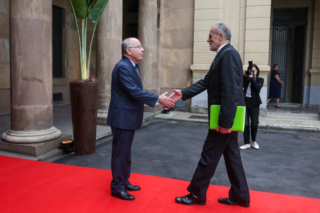 2025年4月28日,巴西里約熱內盧金磚國家外長會議期間,巴西外長毛羅·維埃拉與中國外長王毅握手。路透社/Pilar Olivares