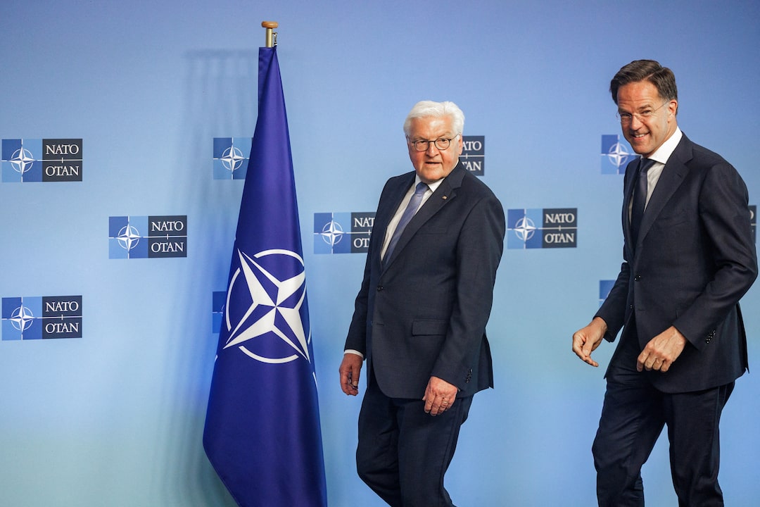 圖集1/3:2025年4月28日,德國總統弗蘭克-瓦爾特·施泰因邁爾與北約秘書長馬克·呂特在比利時布魯塞爾的北約總部出席德國加入北約70週年紀念儀式時的反應。 奧利維爾·馬蒂斯/路透社