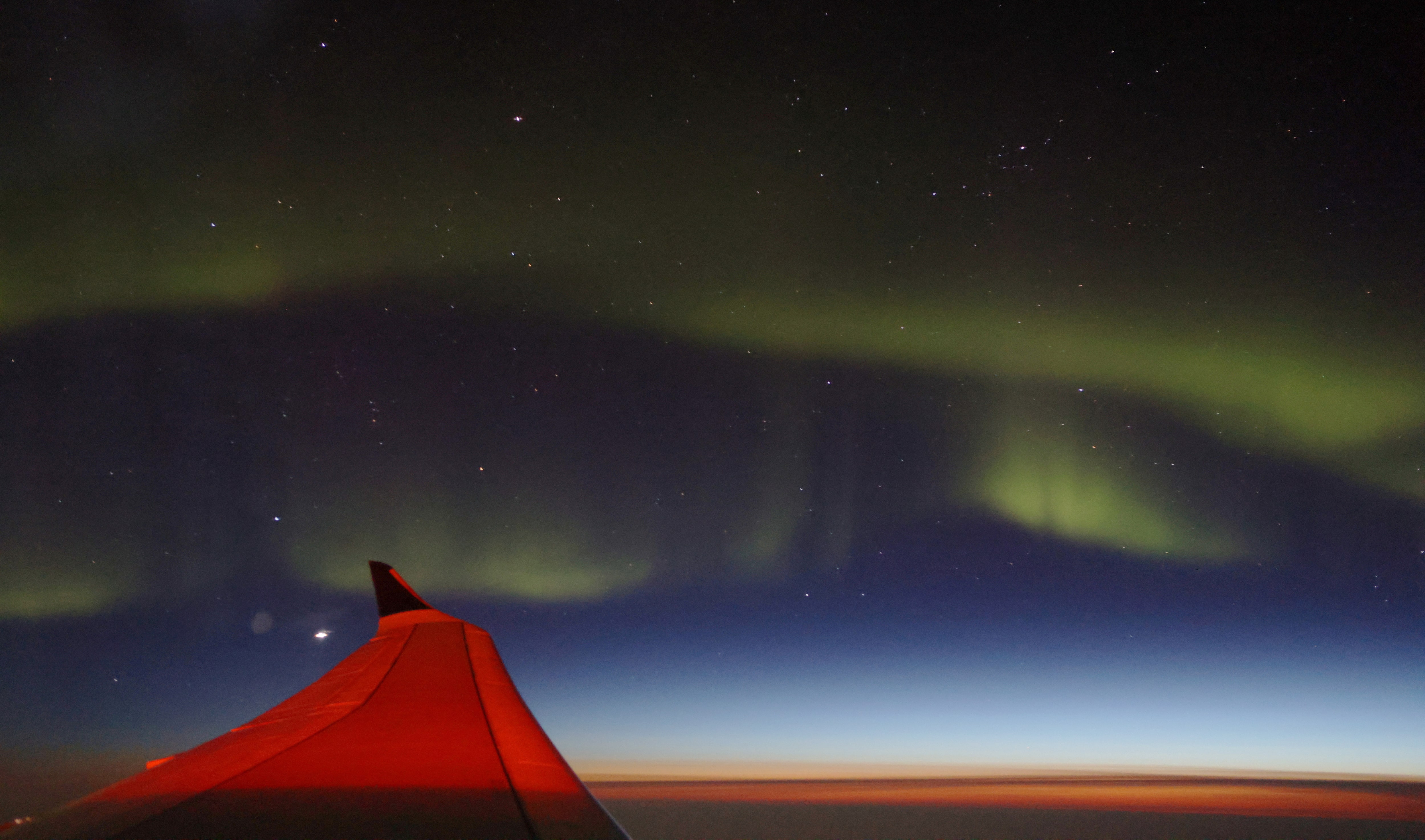 2023年4月28日,從飛往歐洲的客機上俯瞰格陵蘭島南海岸時,被稱為北極光的極光點亮了天空。路透社/吉姆·厄克特 當日TPX圖片 4月22日 - 今年六月,一架美聯航飛機將降落在格陵蘭首府努克。這架波音737在跑道上減速時看似平平無奇——但這次從新澤西州紐瓦克起飛、歷時四小時的抵達,將標誌着這座世界最大島嶼新時代的開端。
