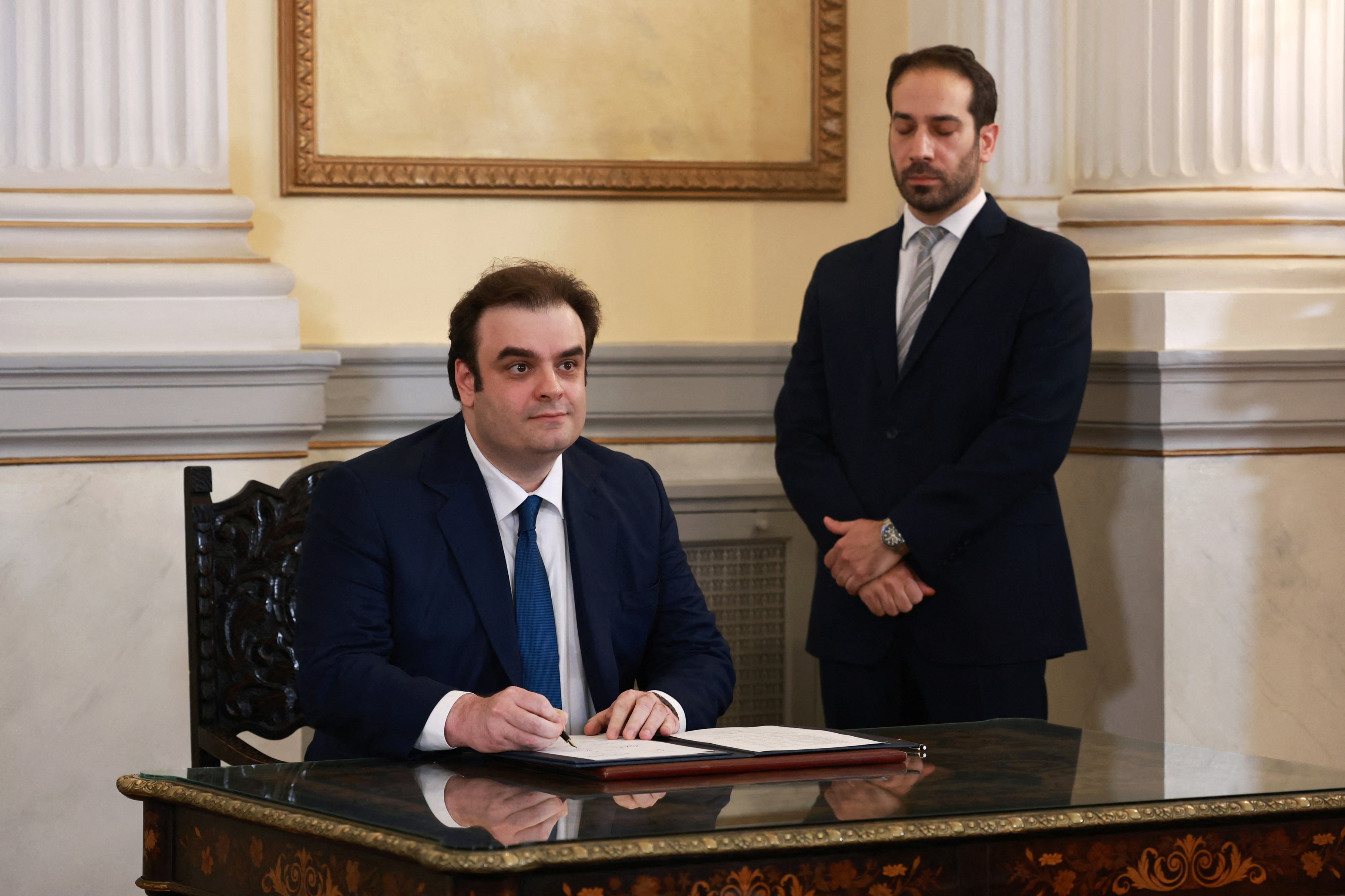 2025年3月15日,希臘雅典總統府,新任命的希臘財政部長基里亞科斯·皮埃拉卡基斯(Kyriakos Pierrakakis)在新政府成員宣誓就職儀式上籤署文件。路透社/Louiza Vradi/檔案照片雅典,4月29日——希臘財政部長週二表示,作為所謂"財政豁免條款"的一部分,希臘將要求歐盟委員會免除其2026年國防支出受歐盟預算規則限制。