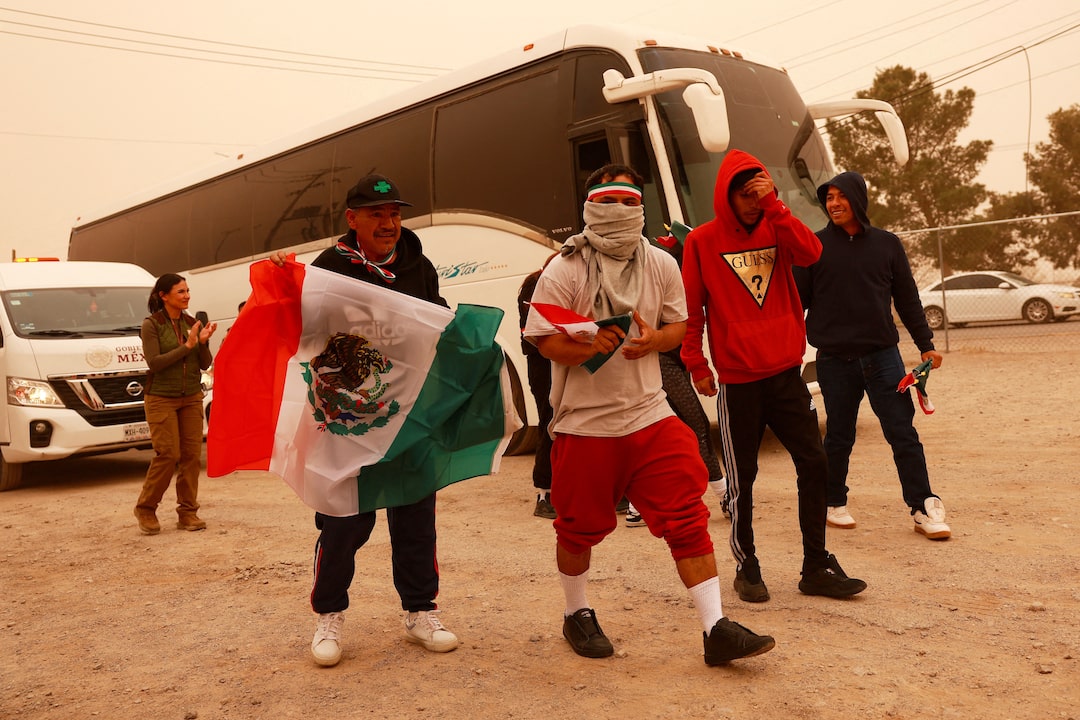 圖1/3:2025年3月6日,被美國驅逐的墨西哥移民站在墨西哥華雷斯城的移民援助中心(臨時庇護所)。路透社/Jose Luis Gonzalez/檔案照片