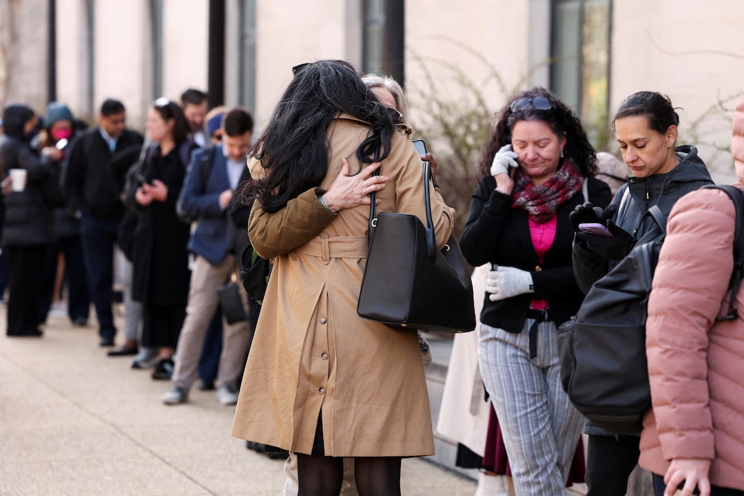 圖1/3 2025年4月1日,美國華盛頓特區,衞生與公眾服務部(HHS)員工在瑪麗·E·斯威策紀念大樓外排隊時相互擁抱。此前有報道稱,特朗普政府解僱了疾病控制與預防中心及食品藥品監督管理局的工作人員,並計劃在HHS削減1萬個工作崗位。路透社/Kevin Lamarque/檔案照片
