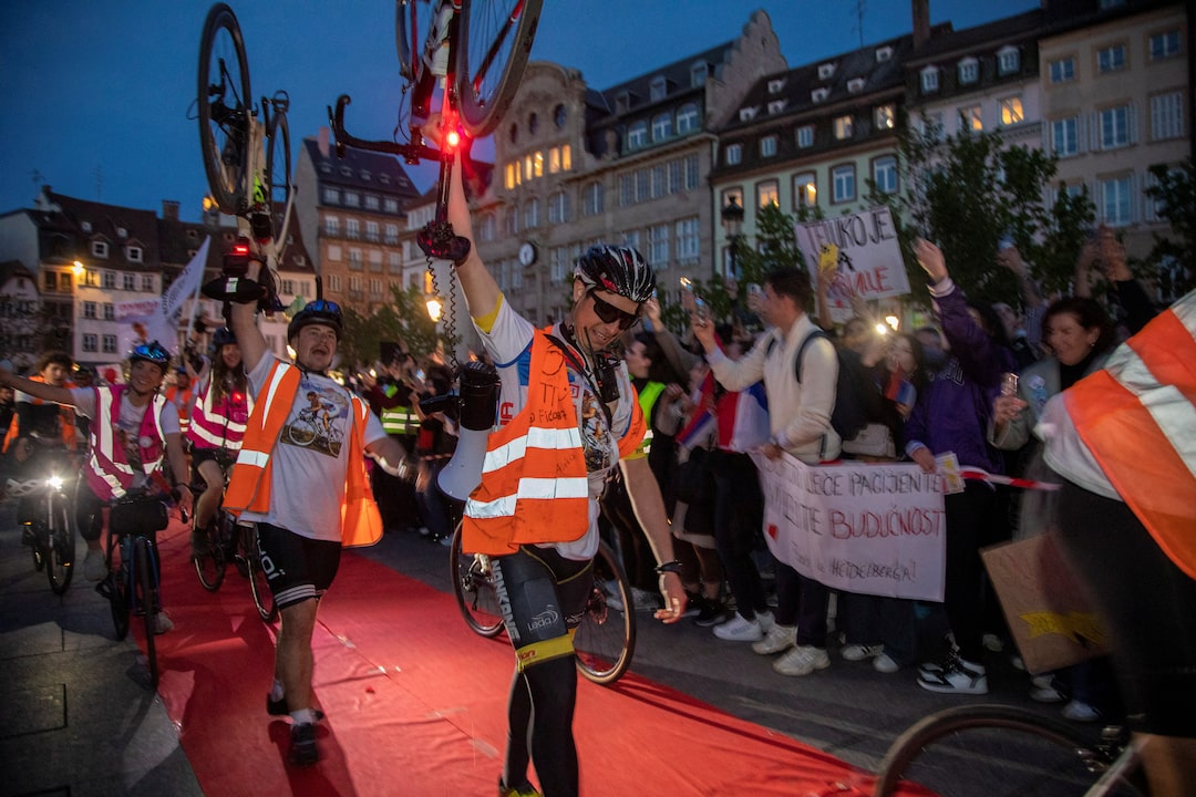 圖1/2 2025年4月15日,法國斯特拉斯堡,塞爾維亞學生騎行者在抵達時慶祝。此次自行車騎行旨在讓歐盟機構關注塞爾維亞國內的反政府抗議活動。路透社/Igor Pavicevic/檔案照片
