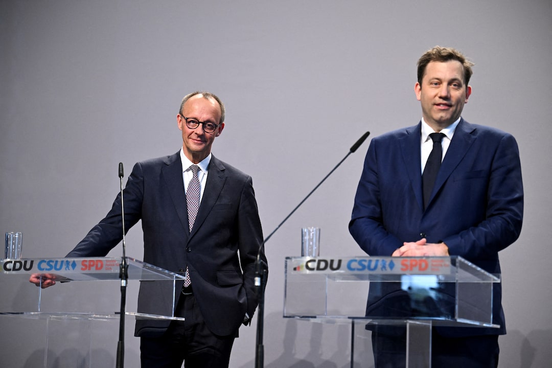 2025年4月9日,德國柏林,社會民主黨(SPD)聯合主席拉爾斯·克林貝爾在與即將上任的德國總理、基督教民主聯盟(CDU)黨魁弗里德里希·默茨,以及基督教社會聯盟(CSU)領導人兼巴伐利亞州州長馬庫斯·索德爾達成聯合政府協議後的新聞發佈會上。路透社/安內格雷特·希爾塞/資料圖片