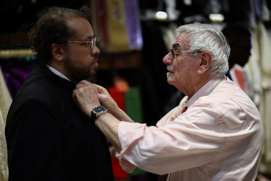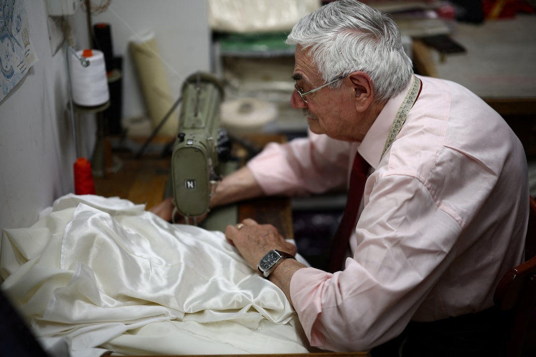 10項中的第1項 2025年4月29日,意大利羅馬梵蒂岡附近,教士袍裁縫拉涅羅·曼奇內利在他的禮儀服飾店裏製作一件白色教皇長袍。路透社/古列爾莫·曼賈帕內