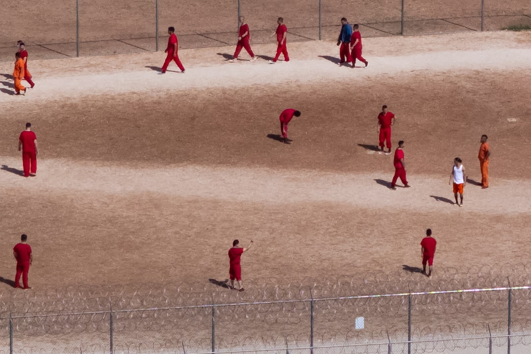 2025年4月28日,美國德克薩斯州安森市,藍帽花拘留中心的被拘留者在院子裏用身體拼出SOS字母。該中心關押着美國最高法院裁決涉及的核心委內瑞拉籍人員。路透社/保羅·拉特傑本週,德克薩斯州小鎮安森的藍帽花移民拘留中心向外界發出了求救信號:S-O-S。