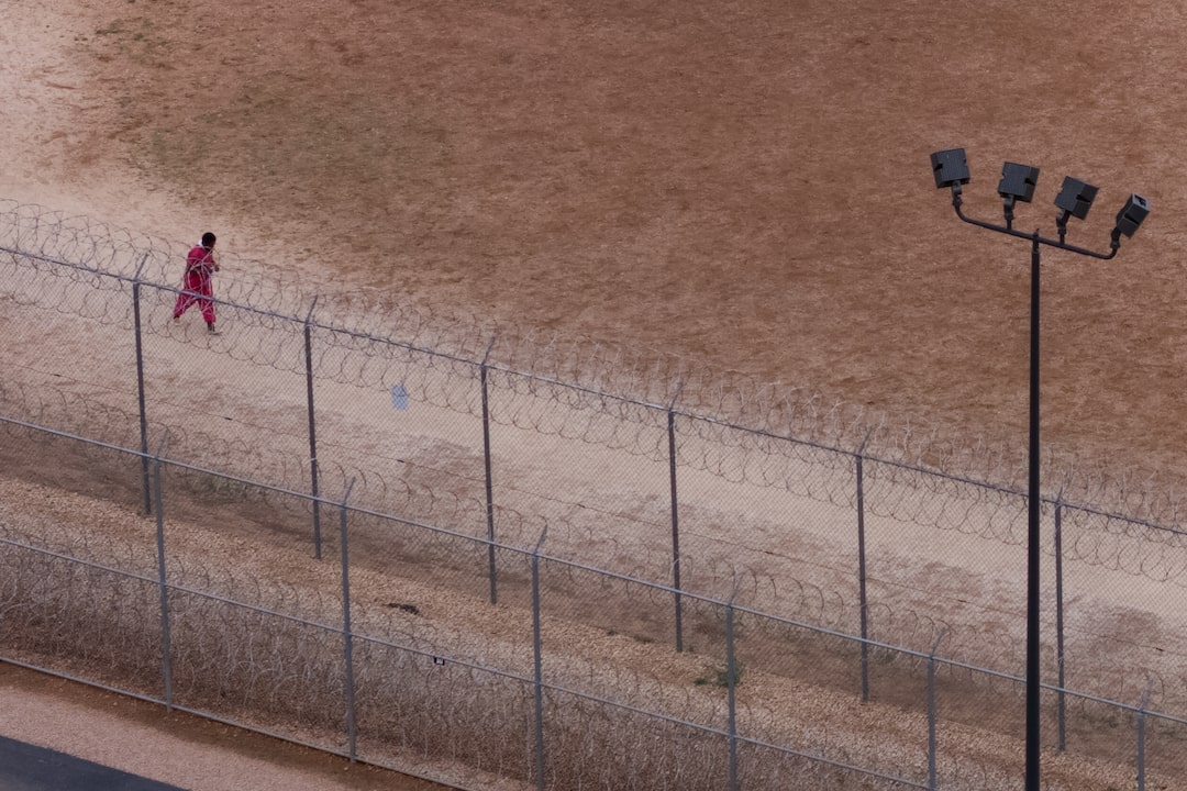 2025年4月23日,無人機航拍顯示美國得克薩斯州安森市藍帽花拘留中心院子裏的被拘留者,這裏關押着美國最高法院裁決核心涉及的委內瑞拉人。路透社/Mike Blake"他絕望極了,“米利安的妻子説,“他告訴我當他走到操場上時,坐下來望着天空,祈求上帝能讓他儘快離開那裏。”