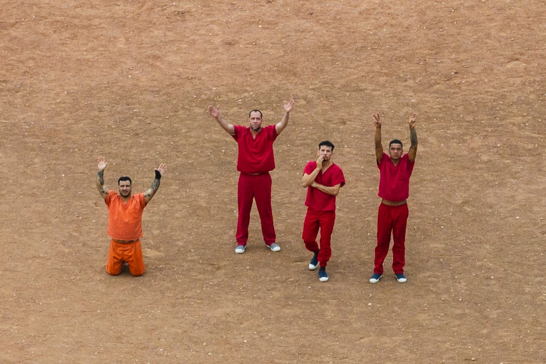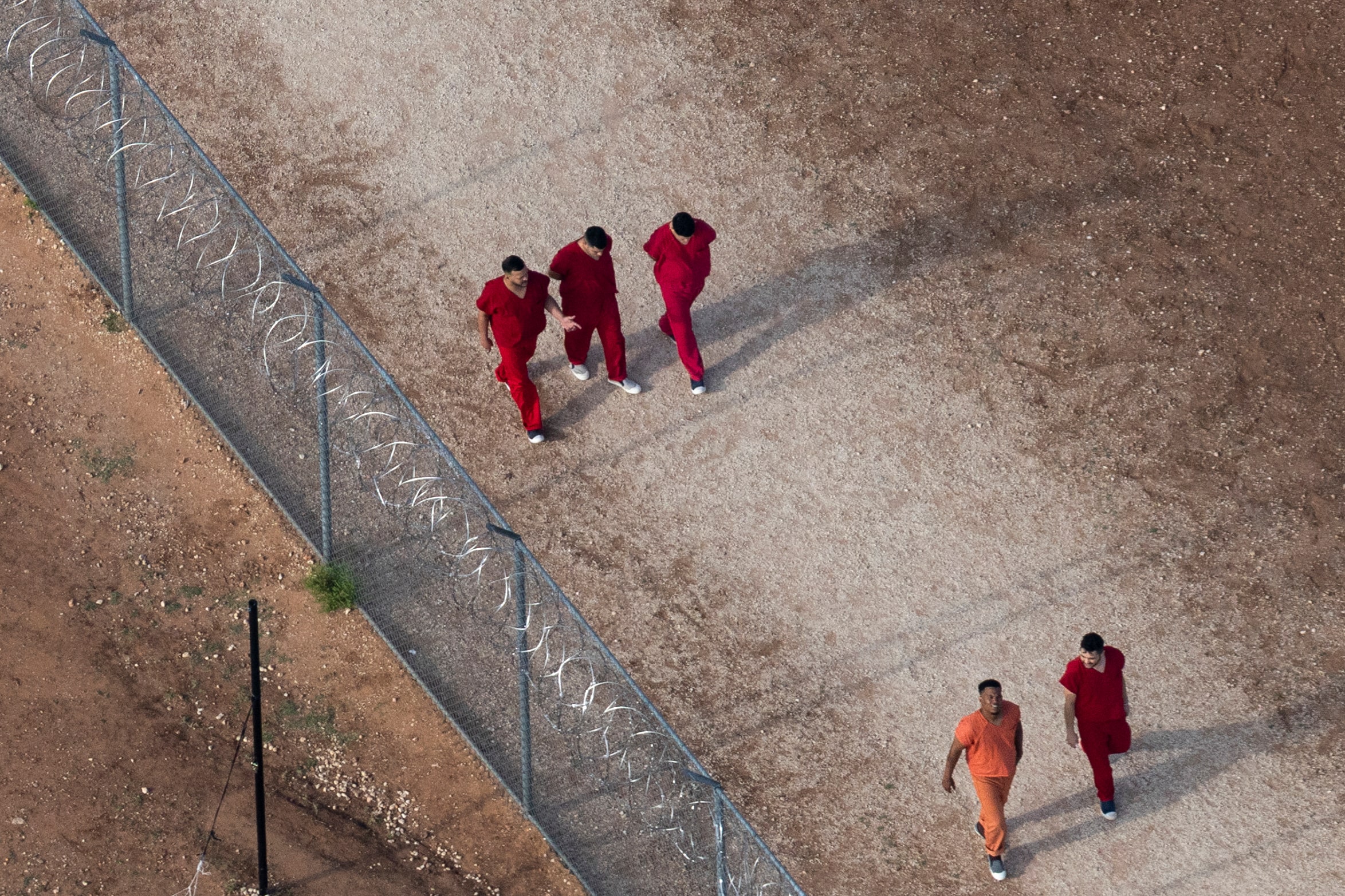 2025年4月28日,美國德克薩斯州安森市,藍帽花拘留中心的被拘留者在院子裏用身體拼出SOS字母。該中心關押着美國最高法院裁決涉及的核心委內瑞拉籍人員。路透社/保羅·拉特傑本週,德克薩斯州小鎮安森的藍帽花移民拘留中心向外界發出了求救信號:S-O-S。