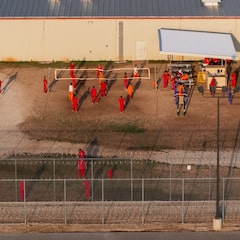 圖集第1張(共5張) 2025年4月23日,無人機航拍顯示美國得克薩斯州安森市藍帽花拘留中心院子裏的被拘留者,這裏關押着美國最高法院裁決核心涉及的委內瑞拉人。路透社/Mike Blake