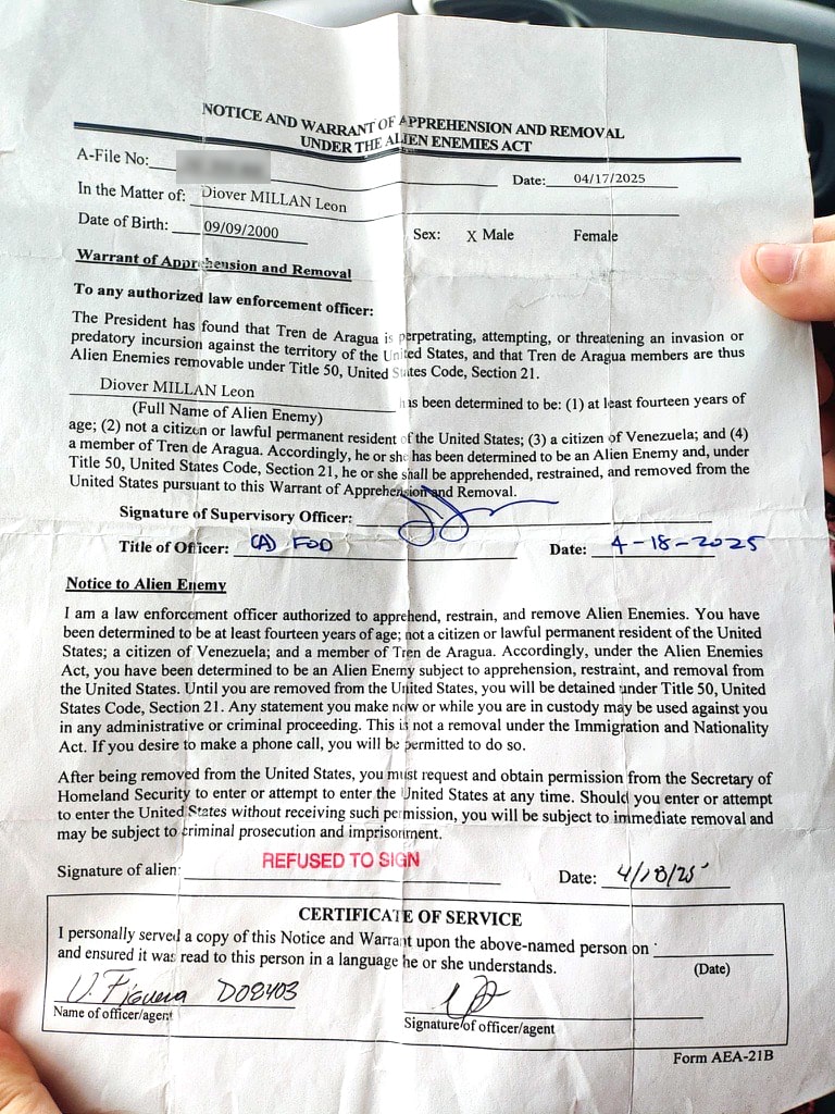 2025年4月18日向委內瑞拉公民迪奧維爾·米蘭出示的《敵僑法案》拘捕及驅逐通知書,當事人拒絕簽字。由家屬提供該官員解釋稱,美國曾試圖依據《敵對外僑法》將他們驅逐,這一程序與他們原定的移民法庭聽證會是分開的。