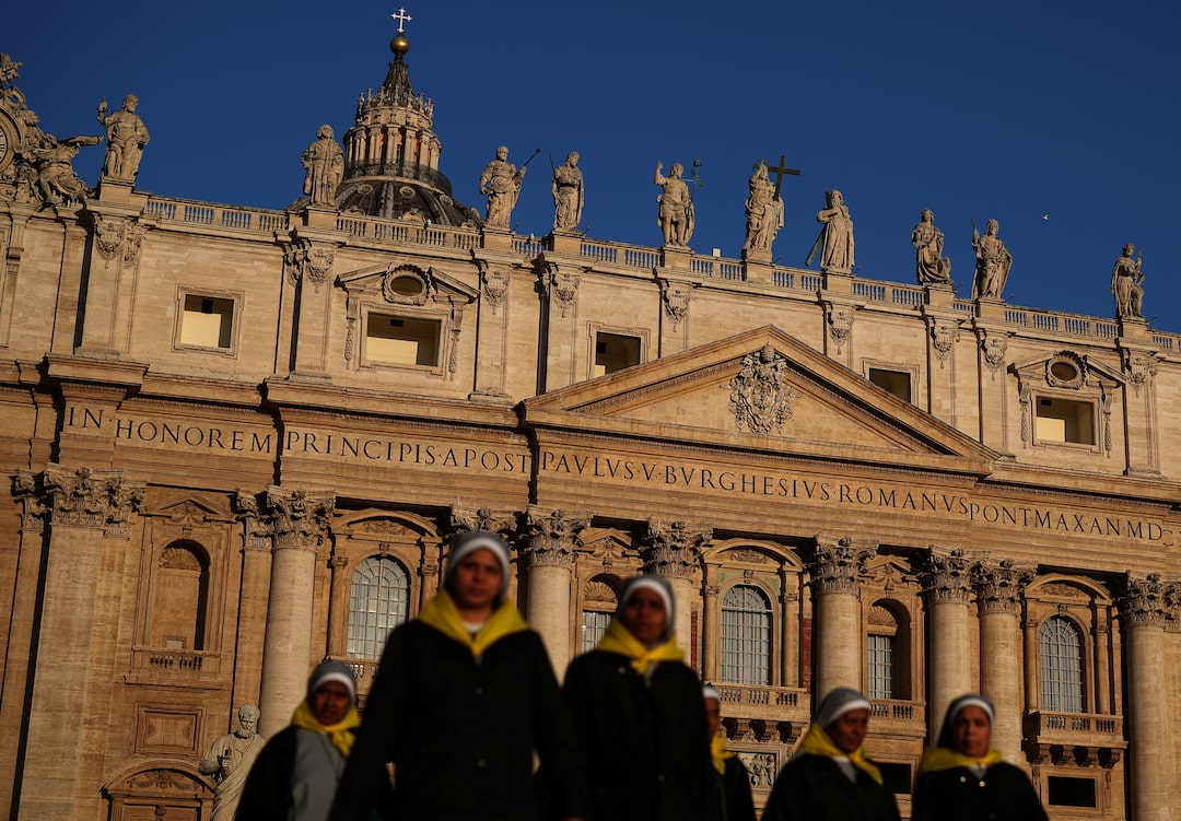 圖1/3:2025年4月30日,梵蒂岡聖彼得廣場上,人們在聖彼得大教堂前行走,為5月7日即將舉行的樞機主教閉門會議做準備。路透社/斯托揚·內諾夫