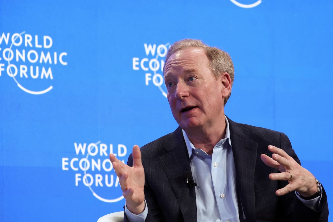 圖1/4:微軟副董事長兼總裁布拉德·史密斯於2025年4月30日在比利時布魯塞爾發表主題演講。路透社/Yves Herman
