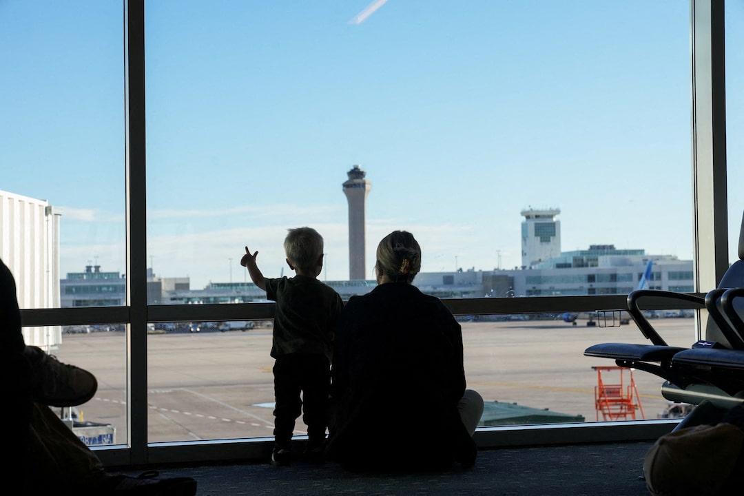 圖集1/2 2025年5月15日,美國科羅拉多州丹佛,一名婦女和兒童在丹佛國際機場航站樓向外張望時,從登機口可見空中交通管制塔。路透社/Megan Varner