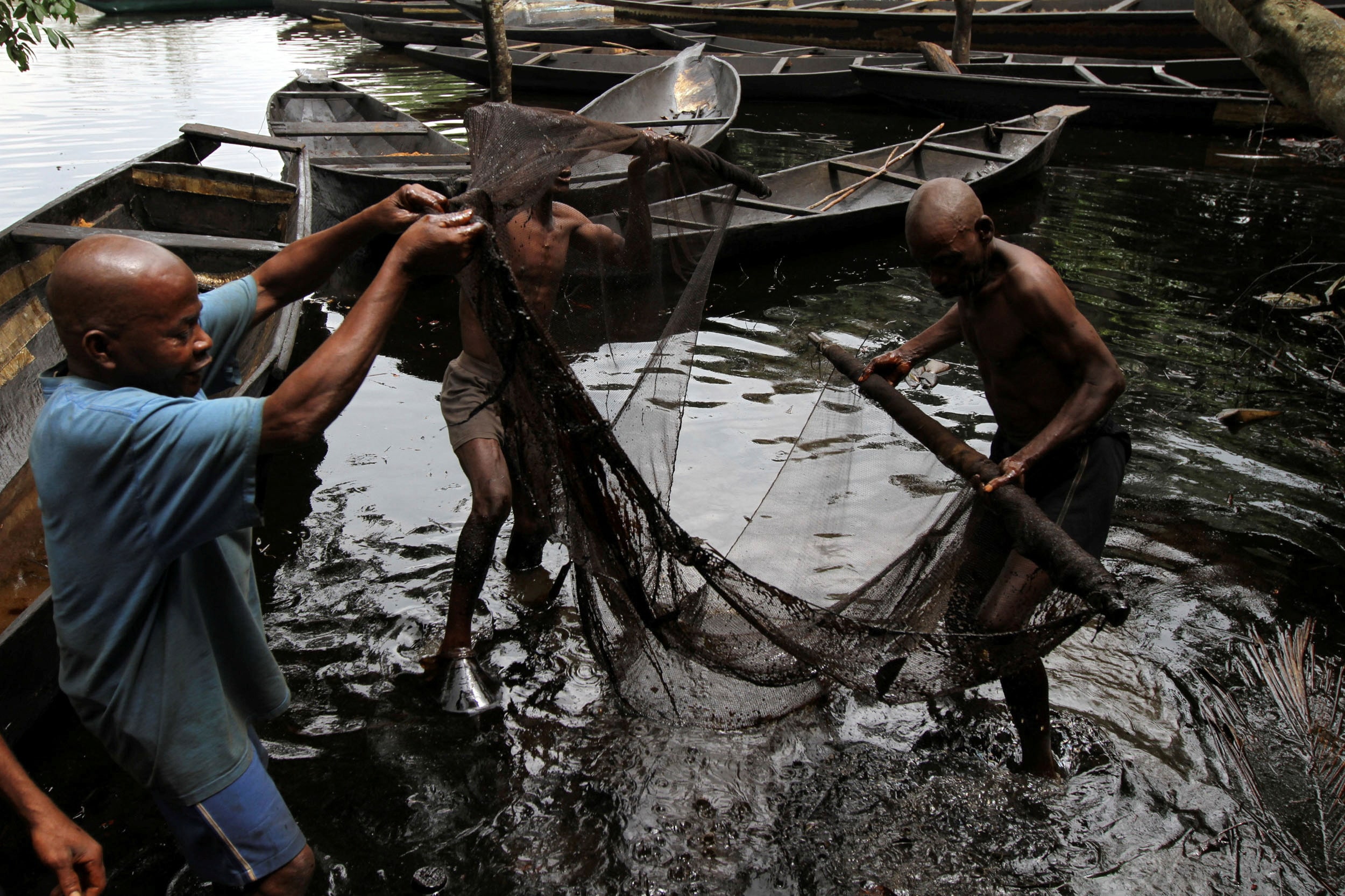 2011年8月20日,尼日利亞三角洲地區奧戈尼蘭Bidere社區,漁民在受污染的河岸邊整理漁網。照片拍攝於2011年8月20日。路透社/Akintunde Akinleye/檔案照片路透社尼日利亞耶納戈亞5月15日電 - 環保權益組織週四表示,尼日利亞跨尼日爾輸油管道發生破裂,原油泄漏至奧戈尼蘭的B-Dere社區。該管道是將陸上油田原油輸送至邦尼出口終端的主要動脈。