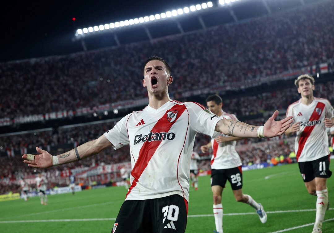 圖1/2 足球 - 解放者杯 - 小組賽階段 - 河牀隊 vs 山谷獨立隊 - 紀念碑體育場,阿根廷布宜諾斯艾利斯 - 2025年5月15日。河牀隊的佛朗哥·馬斯丹圖諾慶祝第三粒進球。路透社/阿古斯丁·馬卡里安