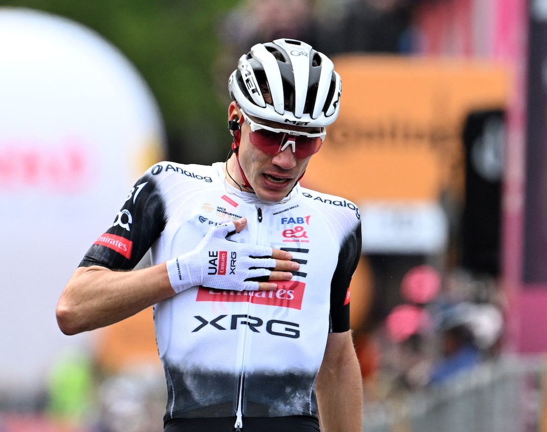 圖集1/2 自行車 - 環意大利賽 - 第7賽段 - 從卡斯特爾迪桑格羅到塔利亞科佐 - 意大利 - 2025年5月16日 阿聯酋航空車隊的胡安·阿尤索在贏得第7賽段後慶祝 路透社/詹妮弗·洛倫齊尼