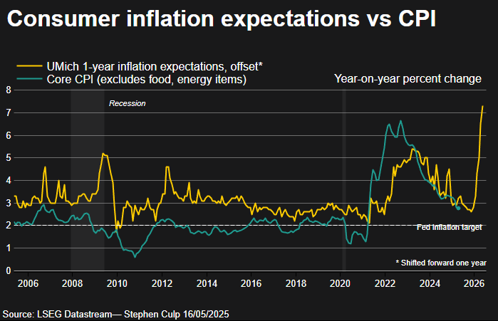 5月16日(路透社) - 華爾街主要指數本週五上漲,連續第五個交易日收高,得益於美中之間此前宣佈的關税休戰,儘管經濟調查數據顯示美國消費者信心有所惡化。