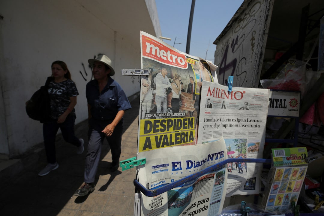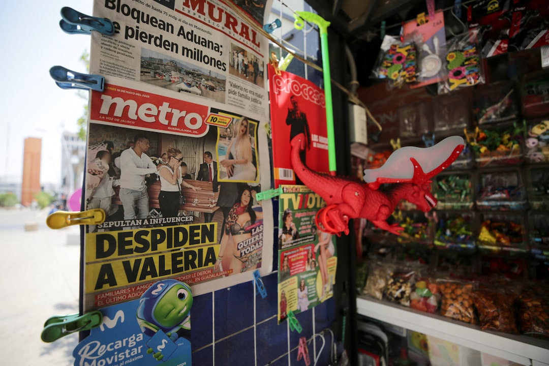 1/3 2025年5月16日,墨西哥瓜達拉哈拉,一家報攤展示着頭版新聞,報道23歲的墨西哥社交媒體影響者瓦萊裏婭·馬克斯在TikTok直播期間遭槍擊身亡的葬禮彌撒。路透社/Stringer