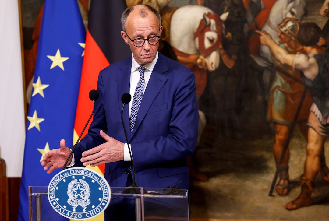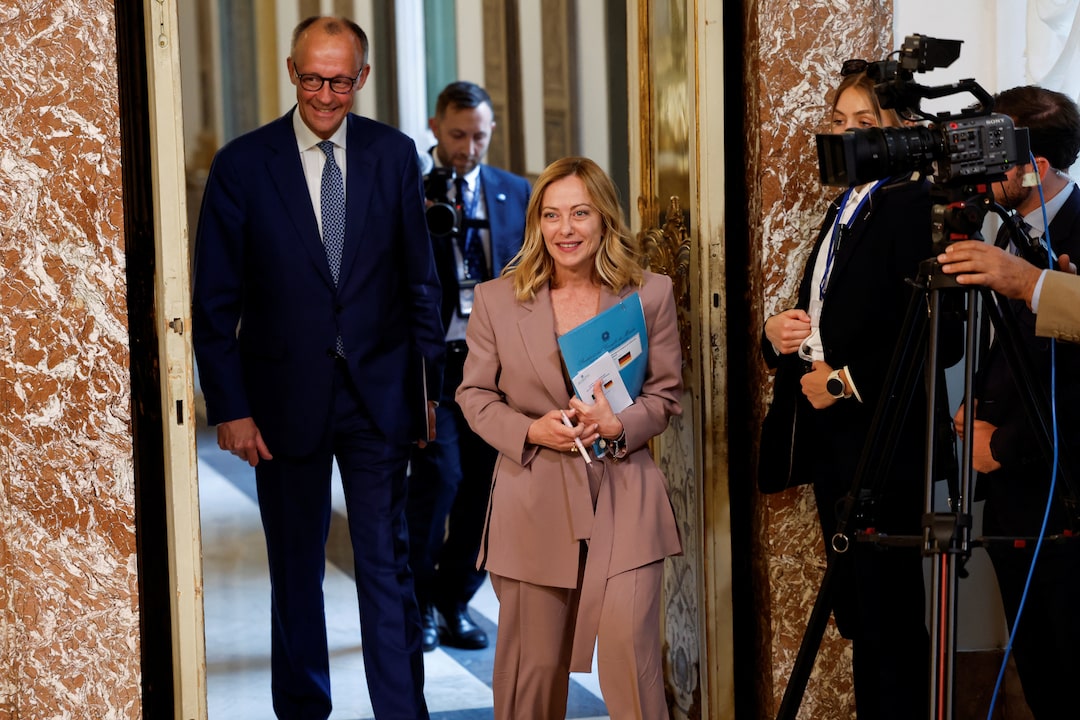 1/4 意大利總理喬治婭·梅洛尼與德國總理弗里德里希·默茨出席新聞發佈會,地點位於意大利羅馬基吉宮,2025年5月17日。路透社/雷莫·卡西利