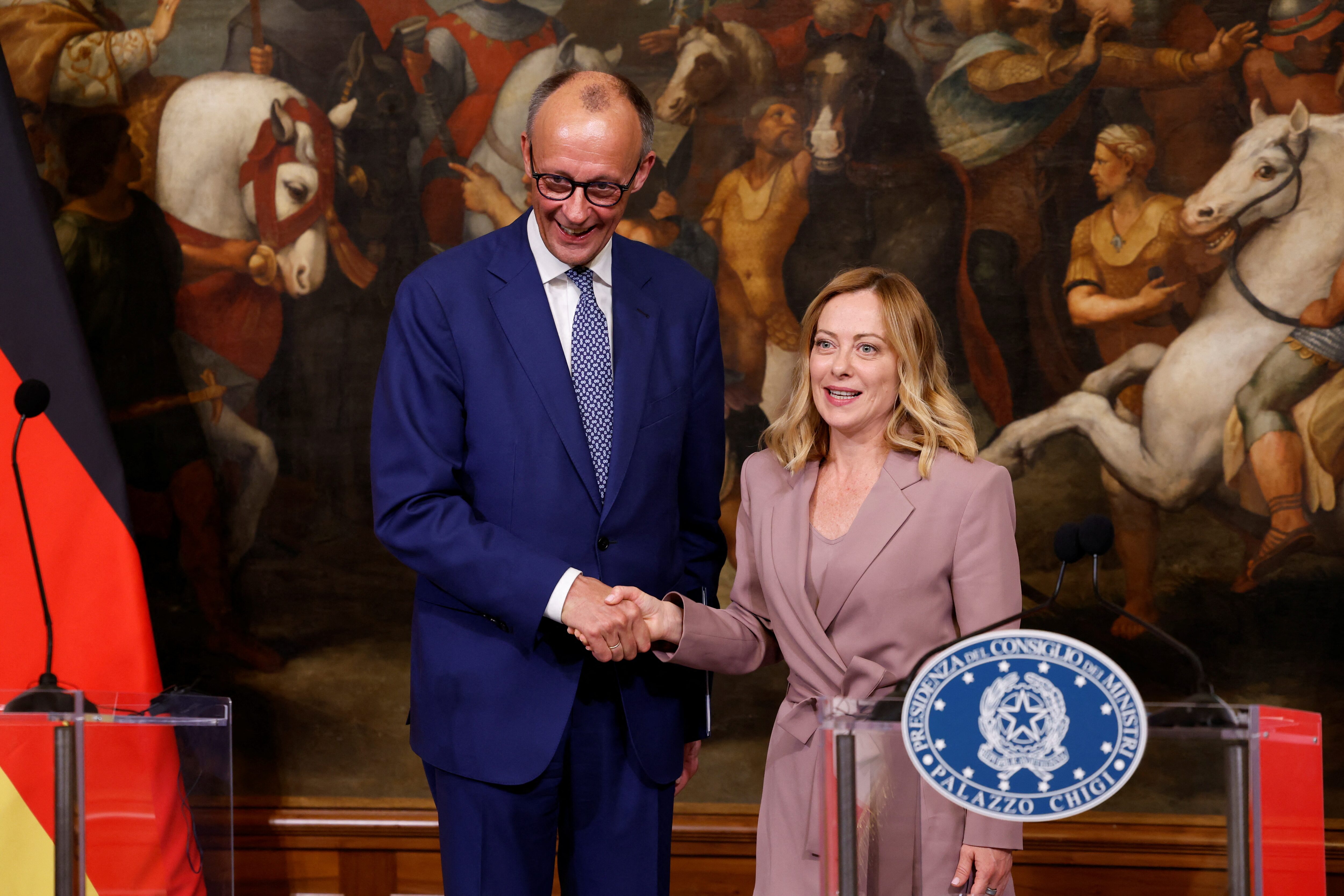 2025年5月17日,意大利總理喬治婭·梅洛尼與德國總理弗里德里希·默茨在羅馬基吉宮舉行的新聞發佈會上握手。路透社/雷莫·卡西利 路透羅馬5月17日電 - 意大利總理喬治婭·梅洛尼週六警告稱,僵化的綠色政策可能摧毀歐洲的工業基礎,並呼籲採取更謹慎的生態轉型方式以保護經濟和社會穩定。