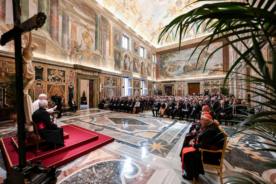 1/4 2025年5月17日,教皇利奧十四世在梵蒂岡會見新千禧年基金會成員。梵蒂岡媒體/伊麗莎貝塔·特雷維桑/路透社供稿