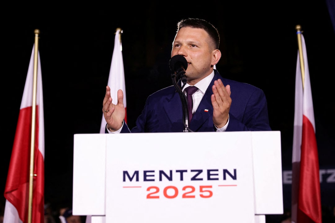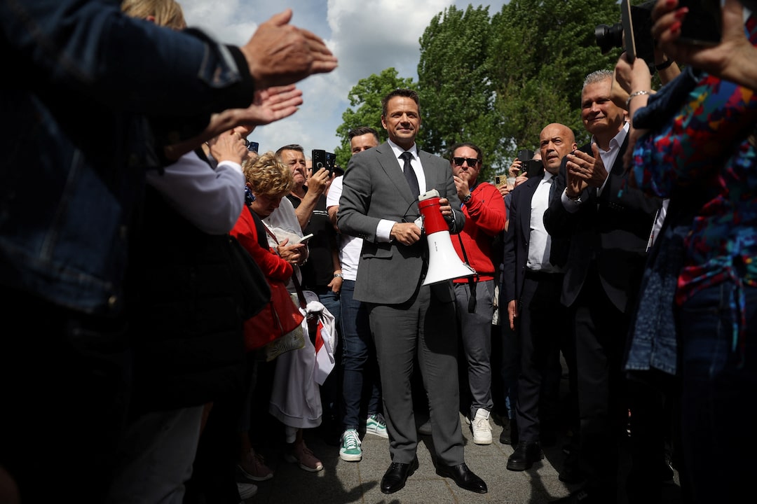 圖1/5:2025年5月14日,波蘭新蘇爾,公民聯盟總統候選人、華沙市長拉法爾·特扎斯科夫斯基在選舉集會上手持擴音器向支持者發表講話。路透社/Kacper Pempel/檔案照片