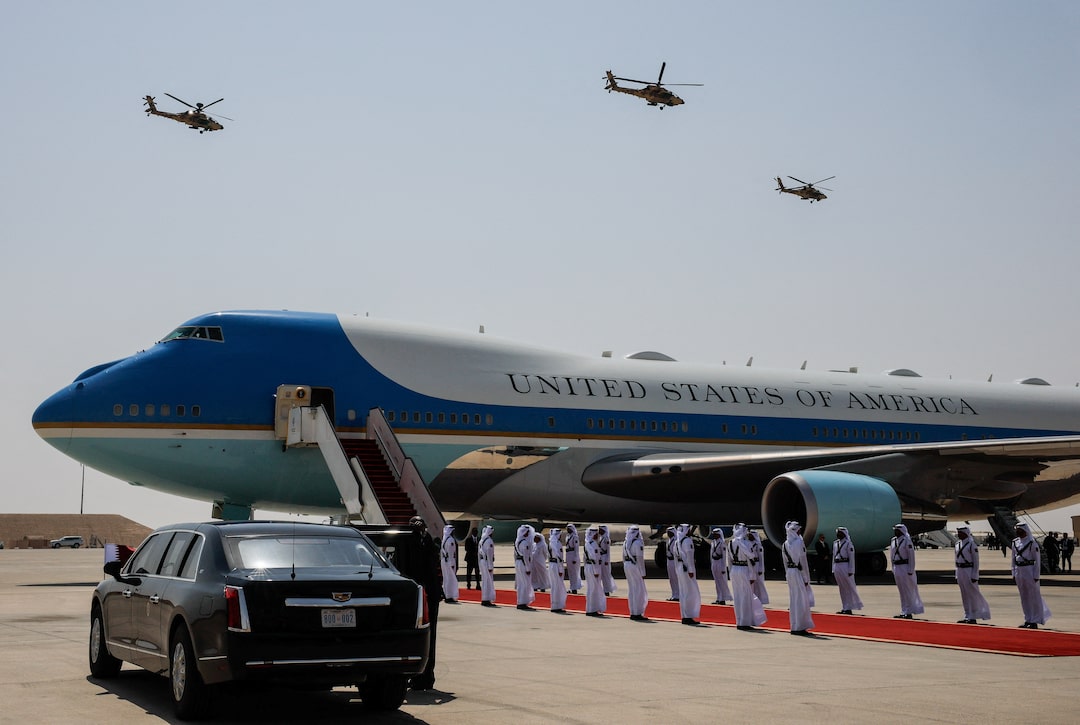 在訪問第二站卡塔爾,特朗普獲贈一架豪華配置的波音747專機,並受到堪比君主規格的盛大歡迎。在鋪着紅毯的儀式、劍舞表演、騎兵隊列和皇家宴會中,特朗普宣稱這個曾向哈馬斯提供鉅額資金支持的國家"絕對正在協助解決"以色列人質危機。