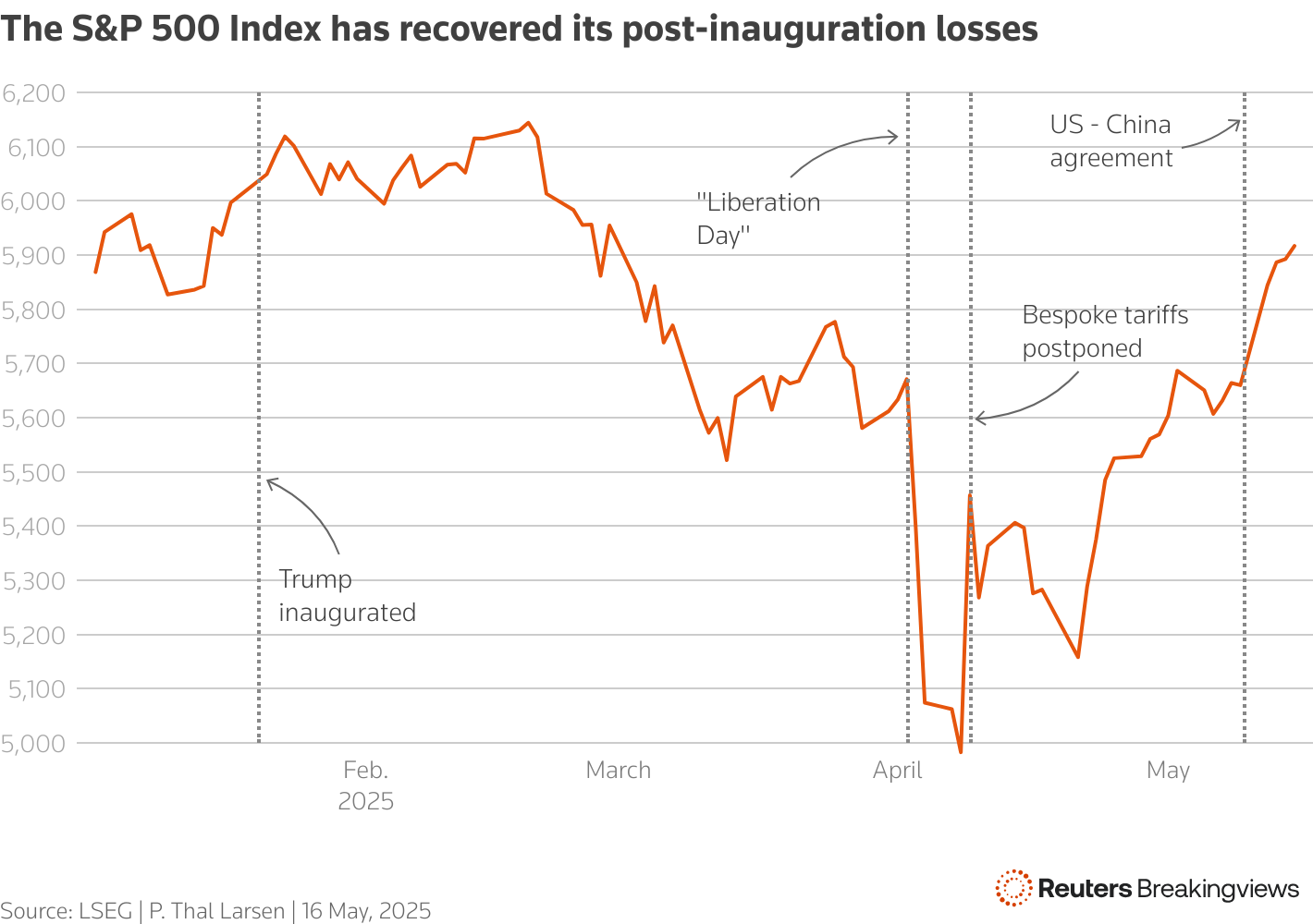 展示標普500指數自2025年1月唐納德·特朗普總統就職以來表現的折線圖。