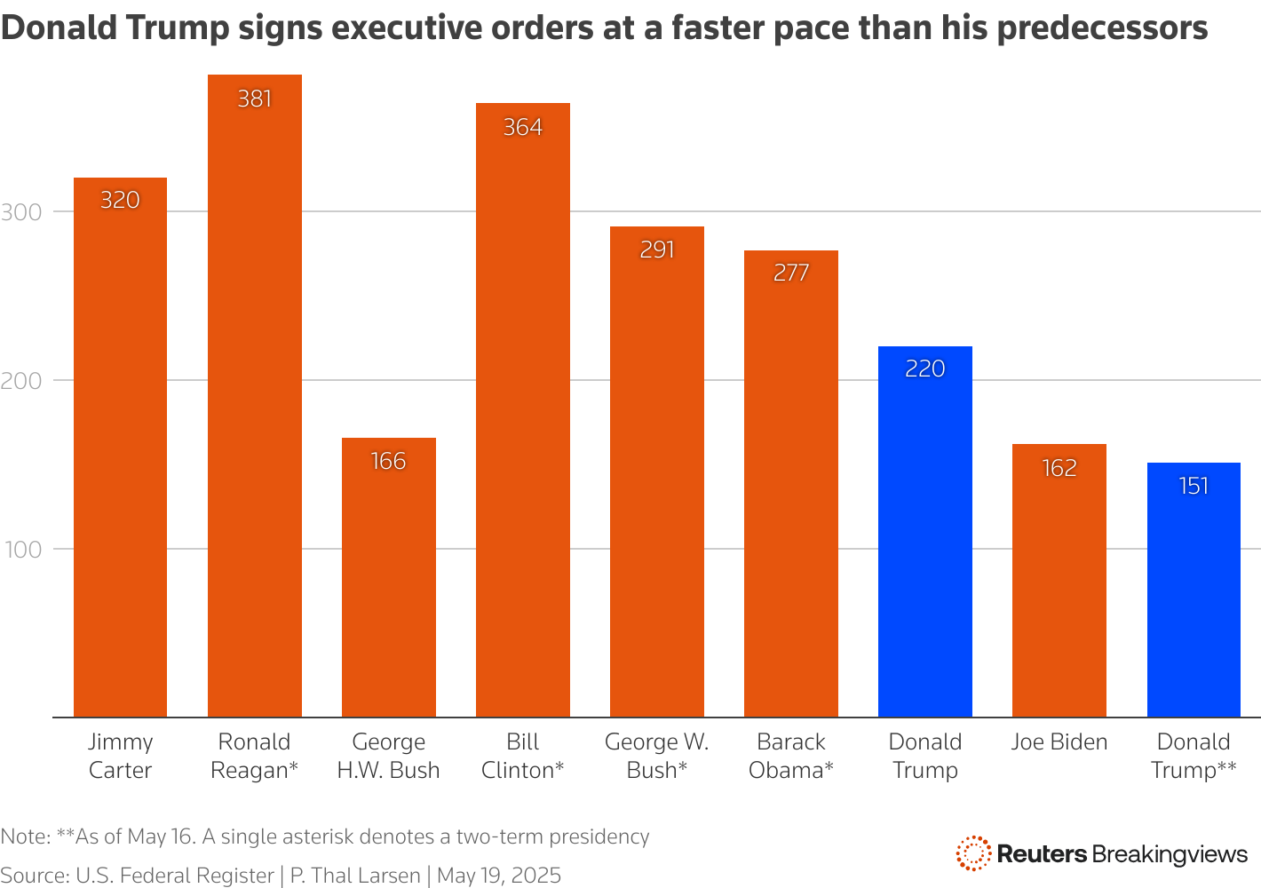 一張展示唐納德·特朗普總統與其前任簽署行政命令數量對比的圖表。